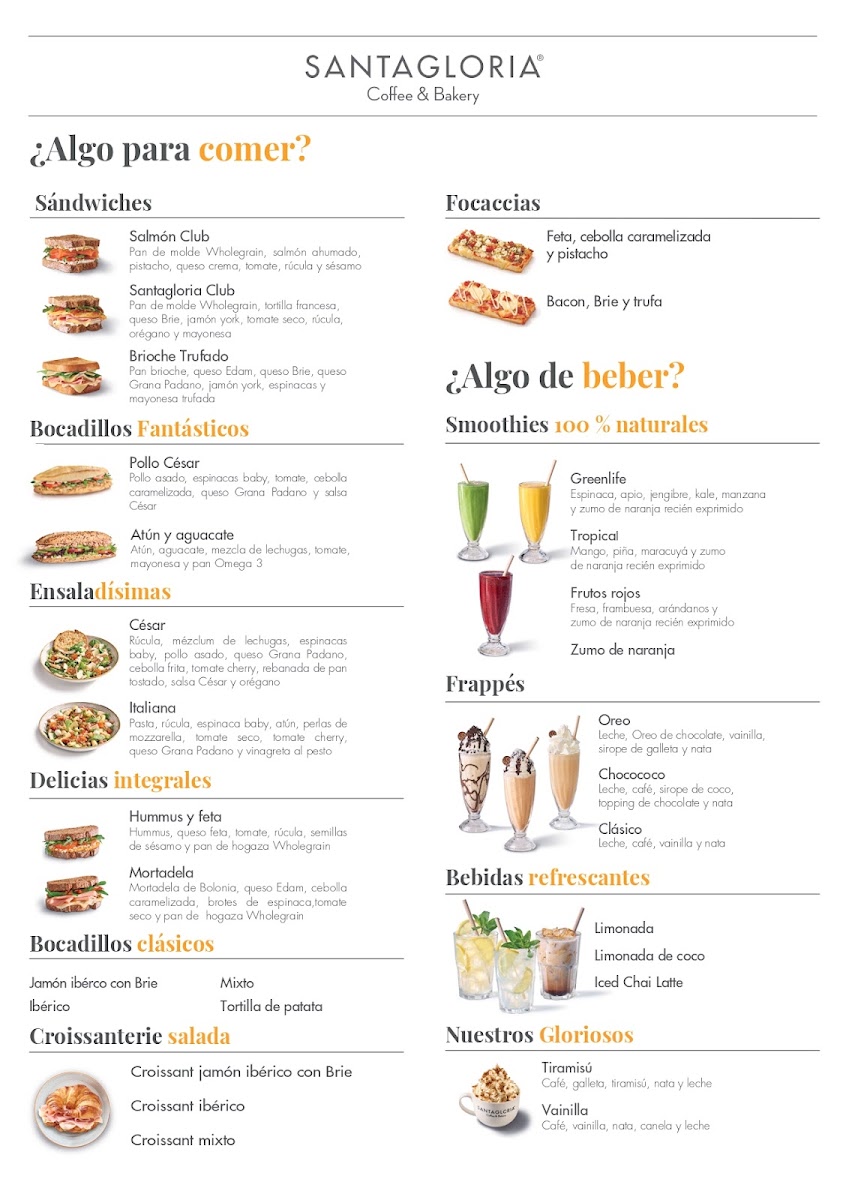 From a reviewer’s perspective, the menu at Santagloria Coffee & Bakery offers a well-rounded selection that balances artisanal breads, indulgent pastries, and satisfying savory options, making it ideal for both quick bites and relaxed café moments. The variety of Panes such as Baguette, Hogaza Sarraceno, and Hogaza de Avena y Semillas reflects a strong focus on traditional baking, while the Bollería dulce stands out with classics like Croissant de Mantequilla, Croissant de Chocolate, and Palmera Topping, all showcasing rich, buttery flavors. The Pastelería section adds further appeal with desserts like Tarta de Chocolate, Tarta de Queso, and Tarta de Zanahoria, perfect for those with a sweet tooth. For something more filling, the Comidas options such as Sándwich Brioche Trufado, Sándwich Salmón Club, and Pollo César provide hearty and flavorful choices. Signature creations in Santas y Glorias, including Gloria Clásica, Gloria Chocolate Negro, and Supergloria de pistacho, give the menu a unique identity, while Bollería Salada like Croissant Jamón Ibérico y Brie caters to savory cravings. Complementing everything is a solid drinks selection with staples like Espresso, Latte, Cappuccino, and the more indulgent Frappé Chocococo. Although specific prices are not listed, the breadth and quality of offerings suggest good value, making the menu both diverse and appealing for a wide range of tastes.